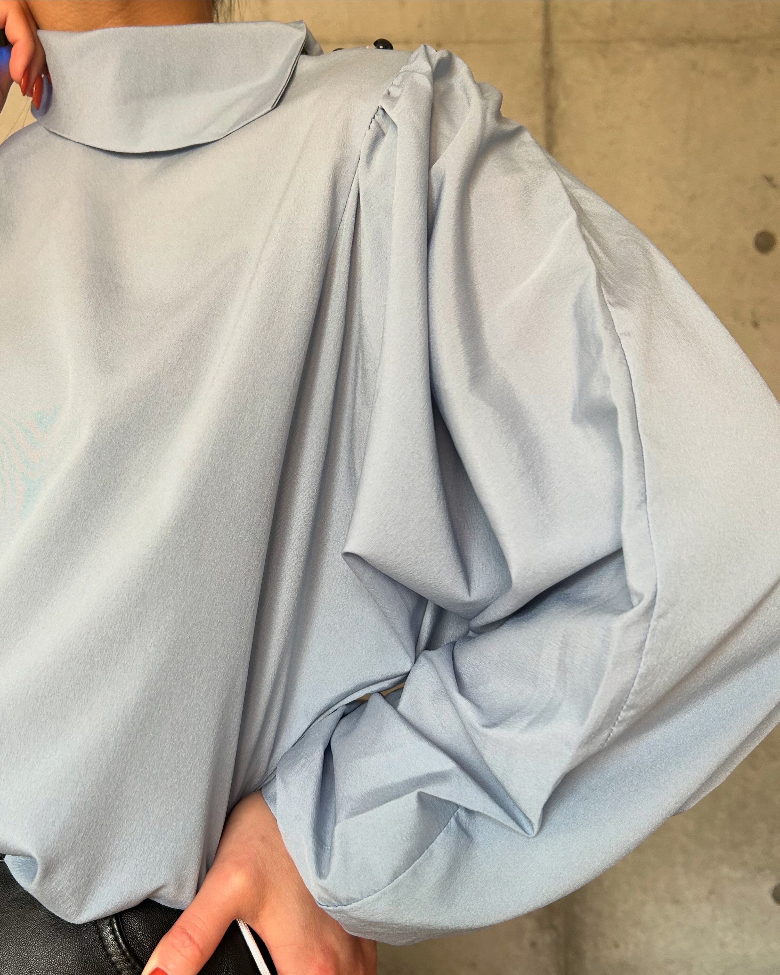 着るとシルエットは袖が広がるボリュームで、上品ながらにも個性あり。