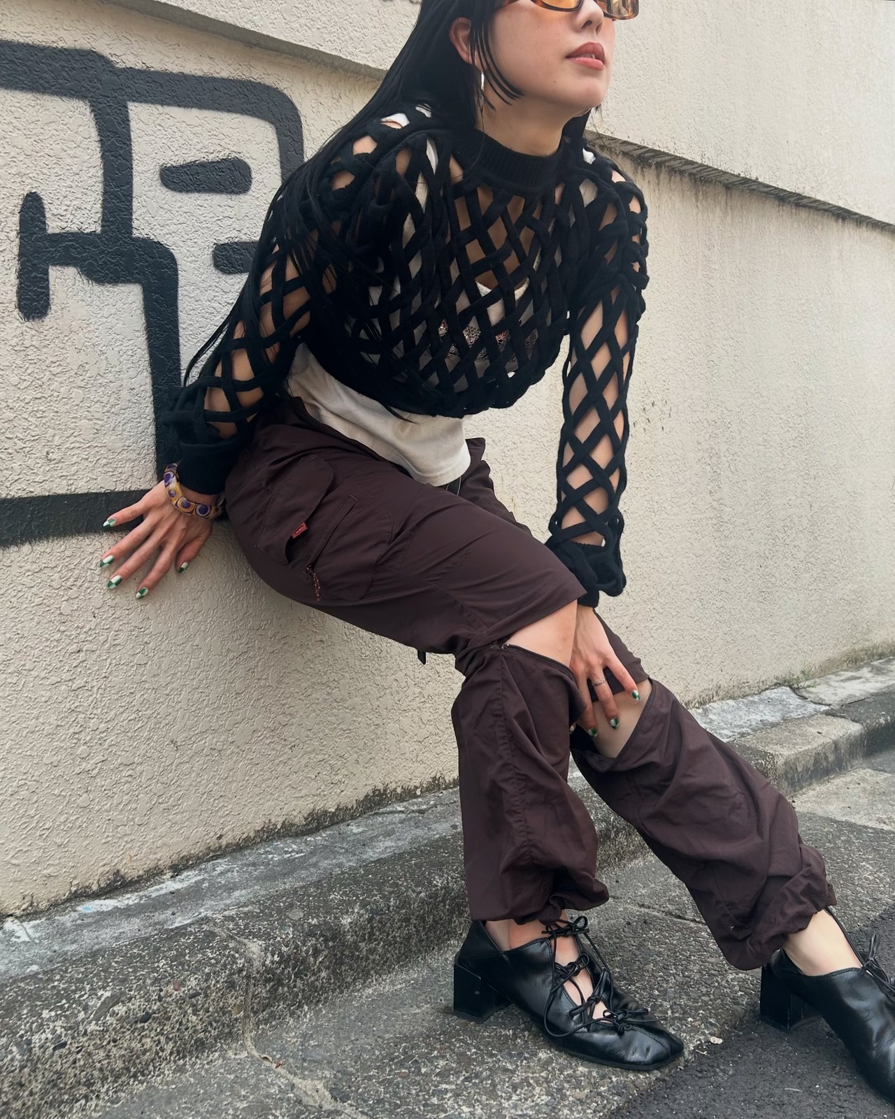 編み編みがかわいいらしいデザインのニットトップス。アップルパイの模様みたいで美味しそう(笑)