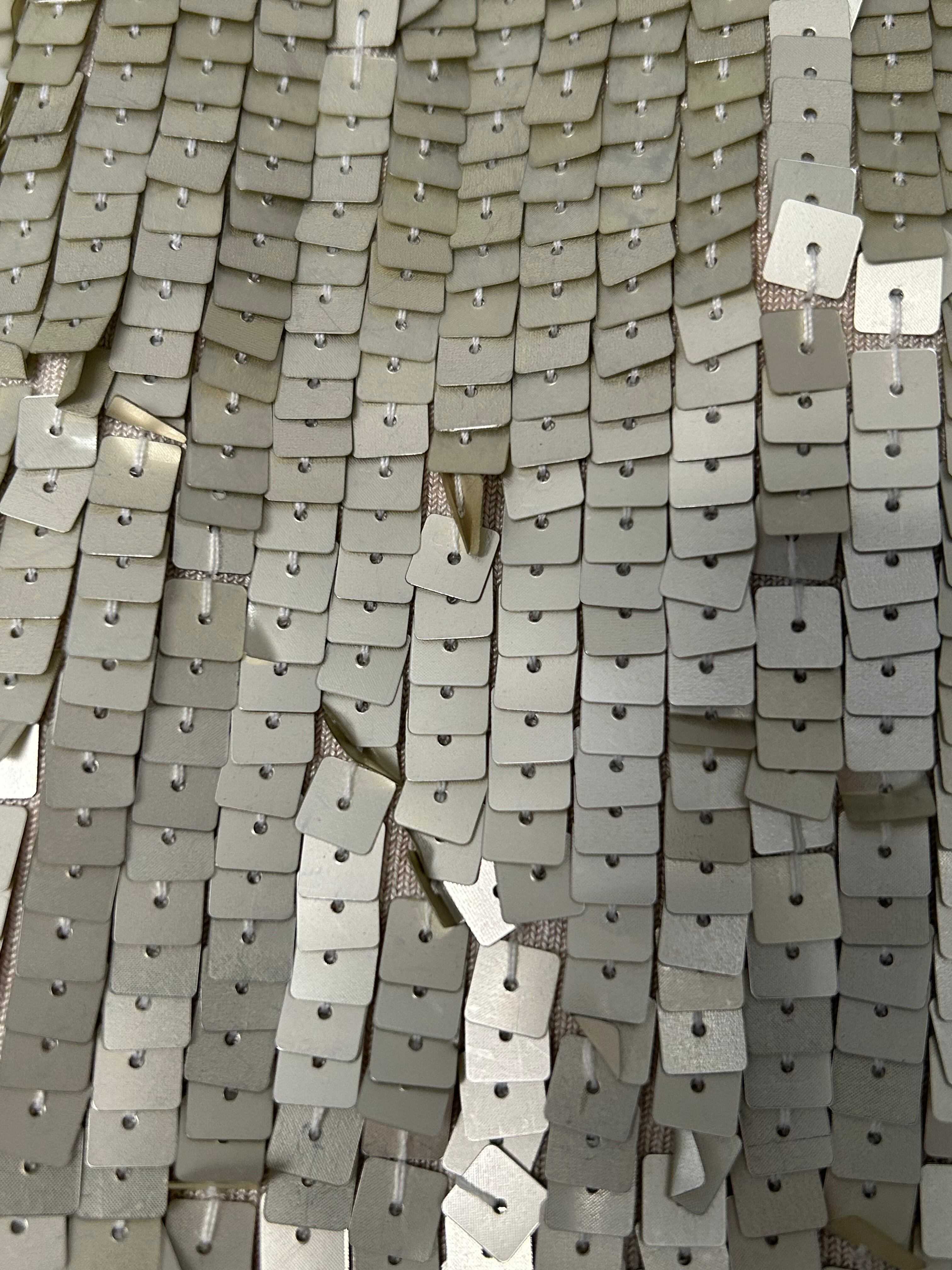 シャンパンゴールドのような気品のある色味がとてもか目を惹きます。スクエア型のスパンコールビーズでマットなのがまた良いですね。
