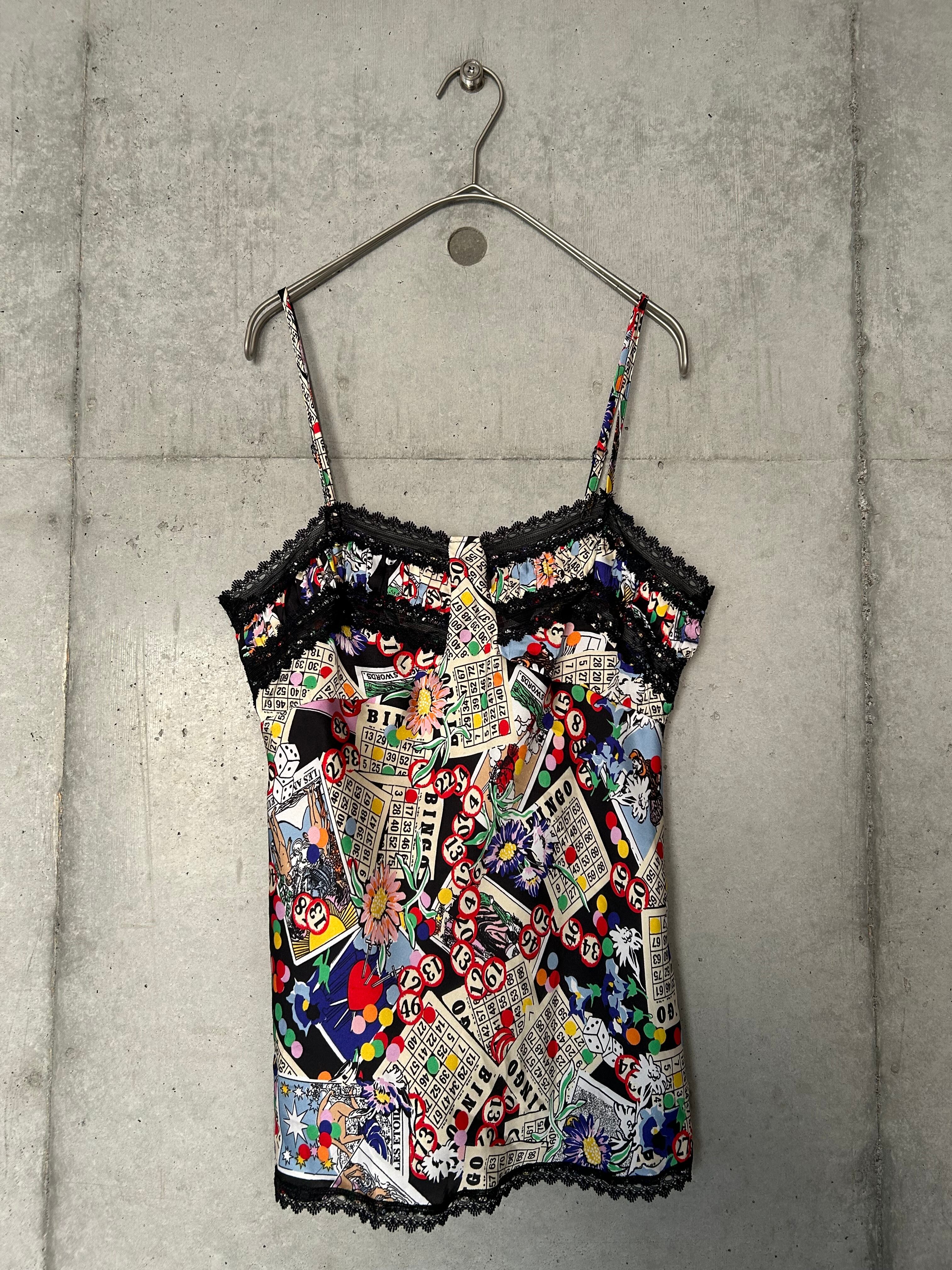 遊び心たっぷりのビンゴカードとポップなアートが散りばめられた、目を引くキャミソール。