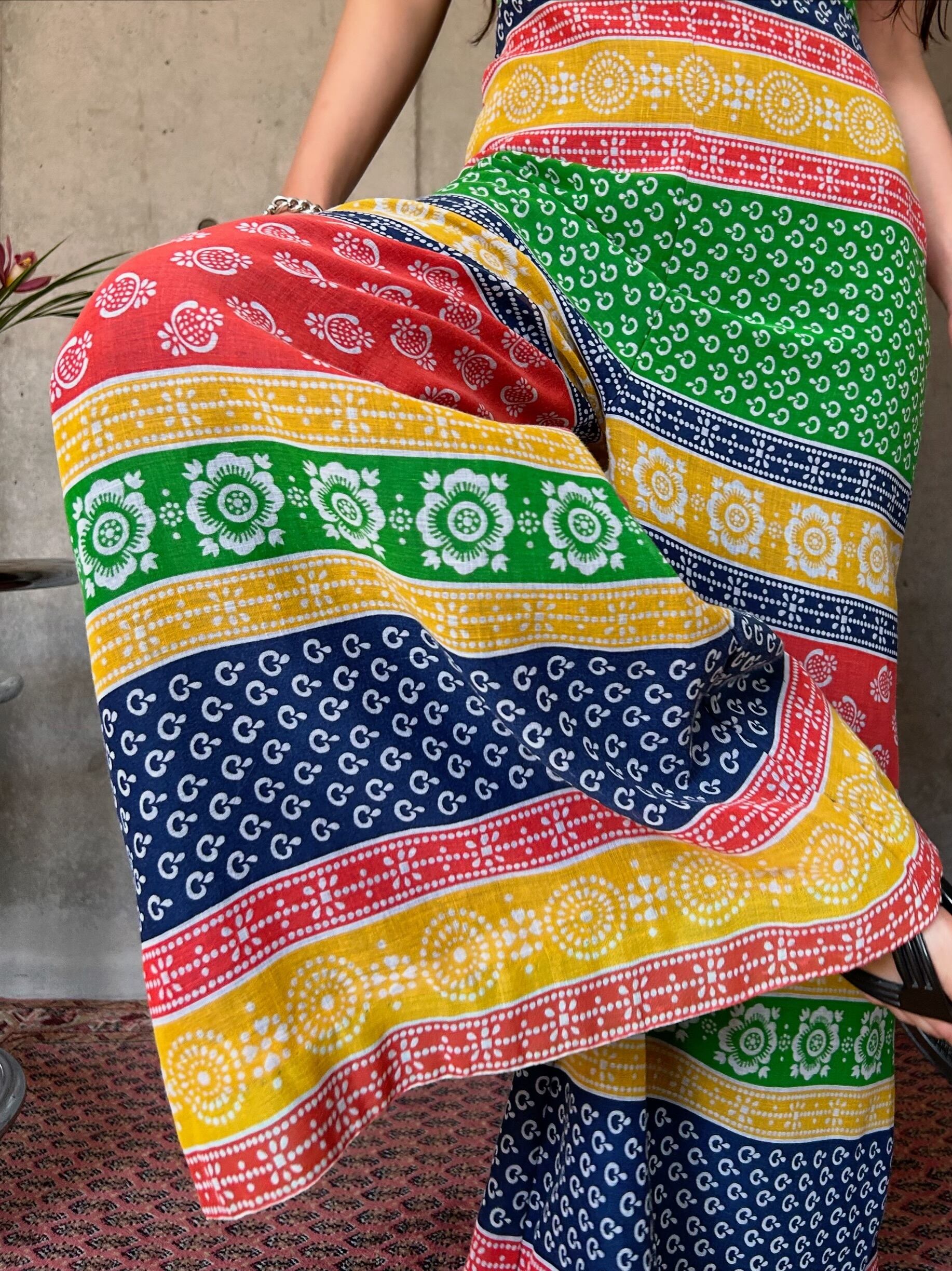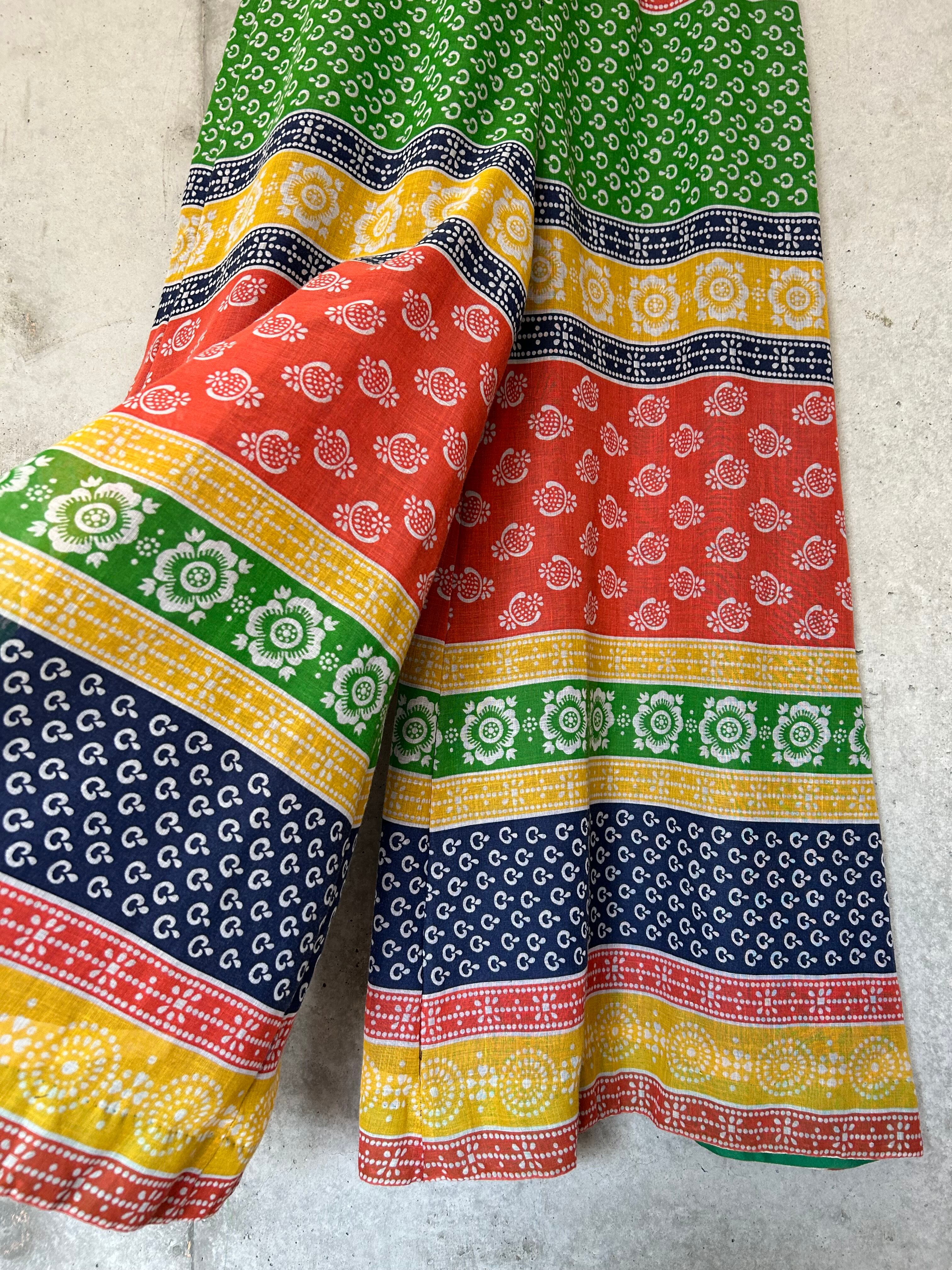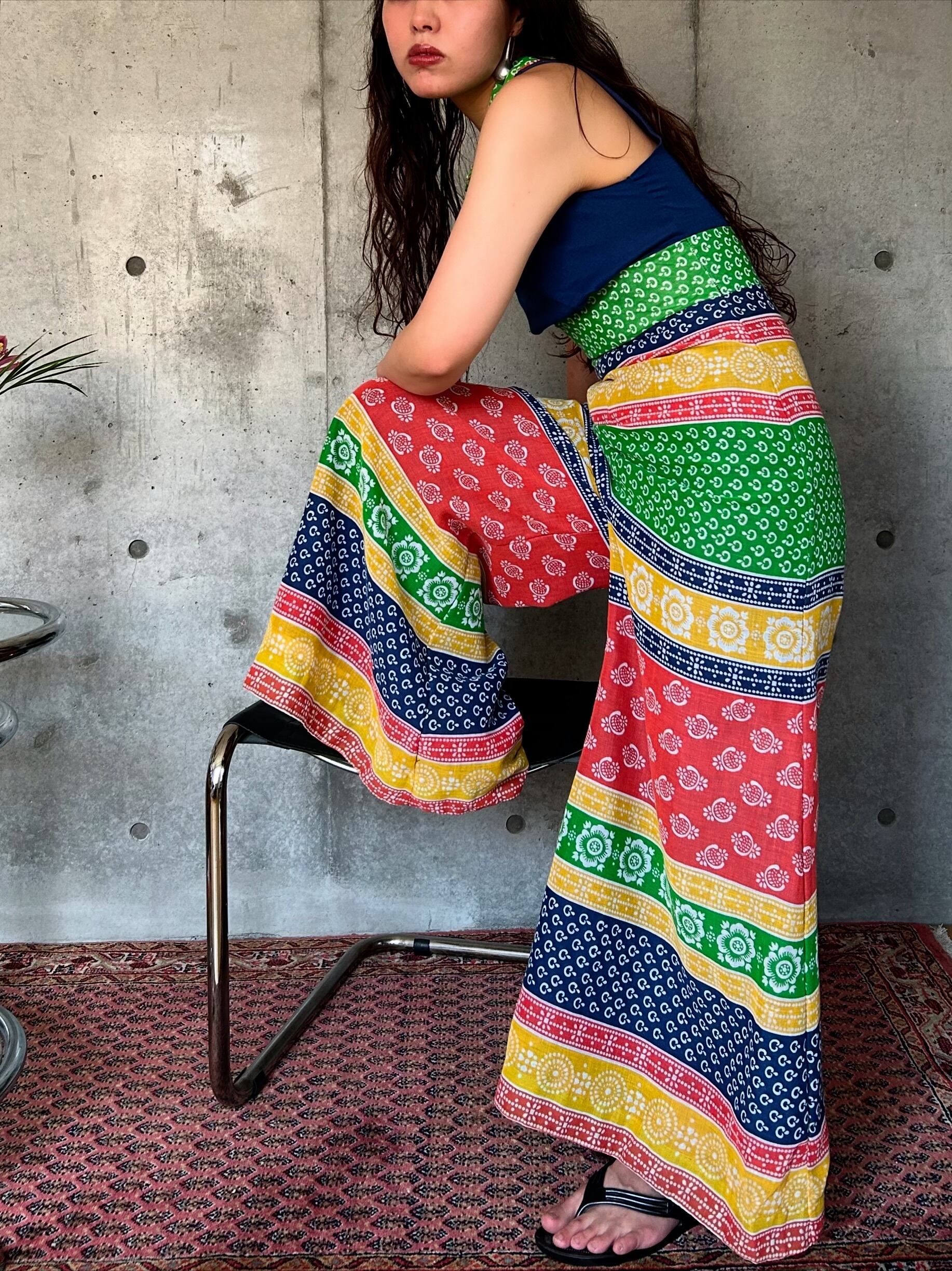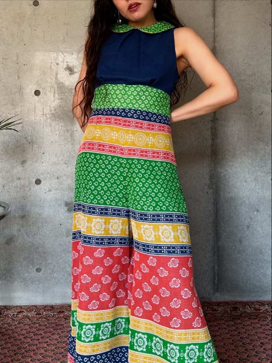 ヴィヴィッドなカラーリングとエスニックパターンが目を惹く、70'sのジャンプスーツ。