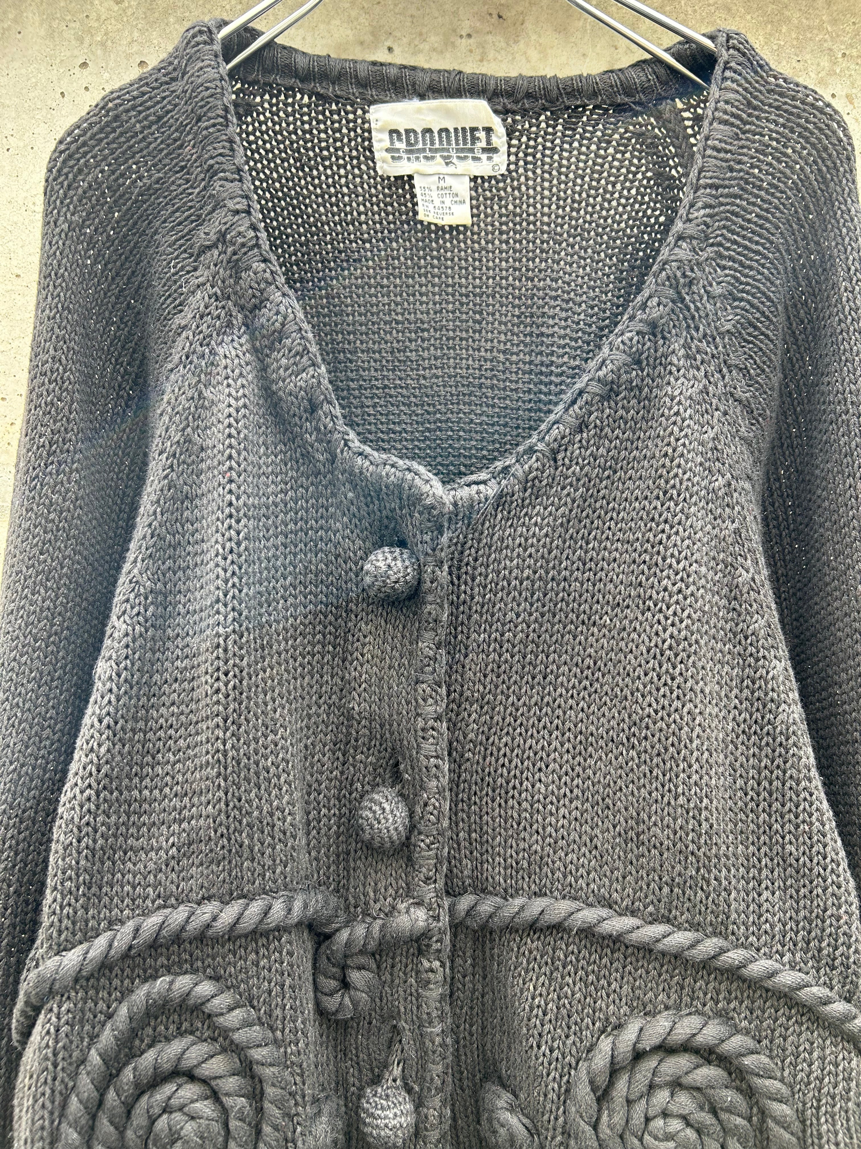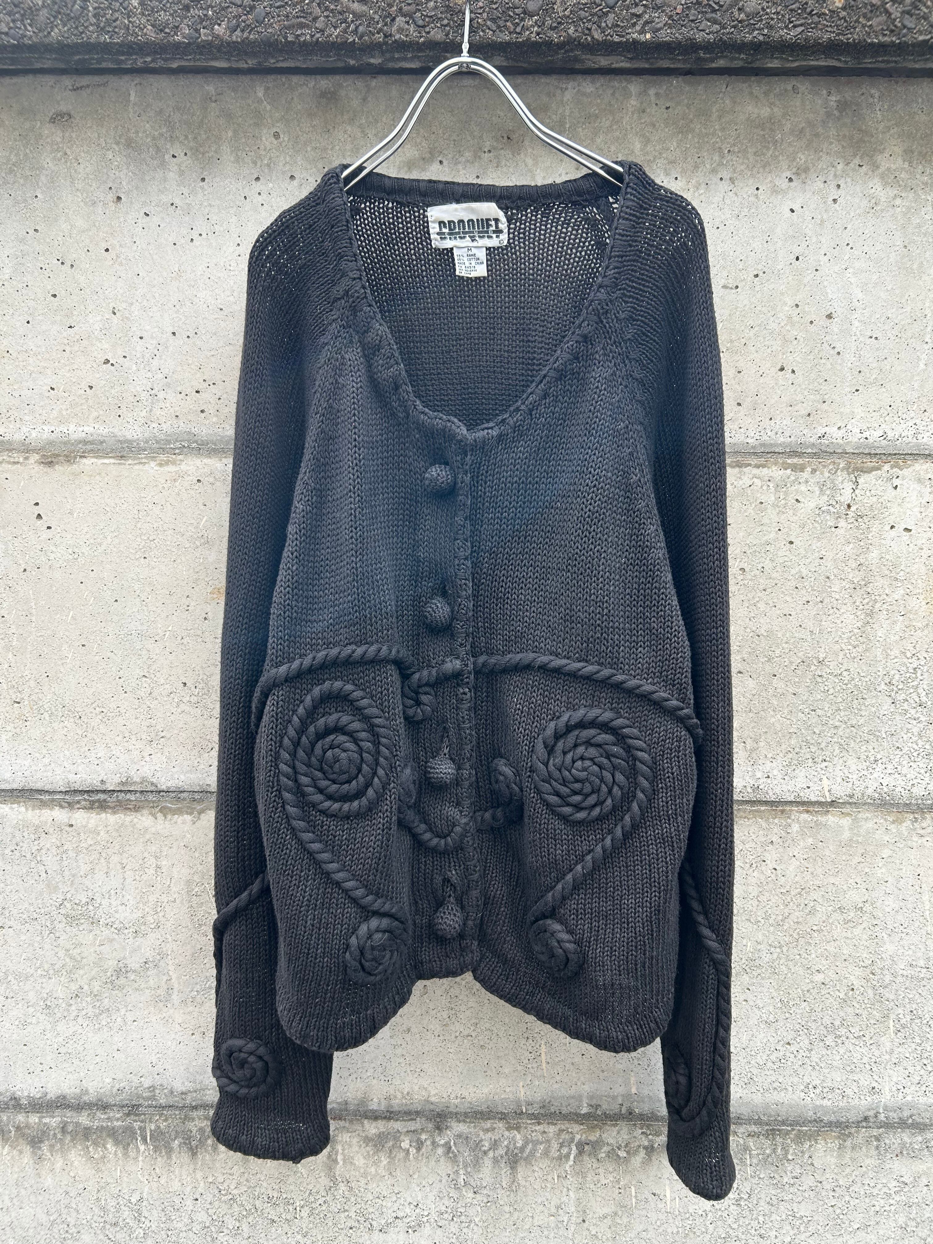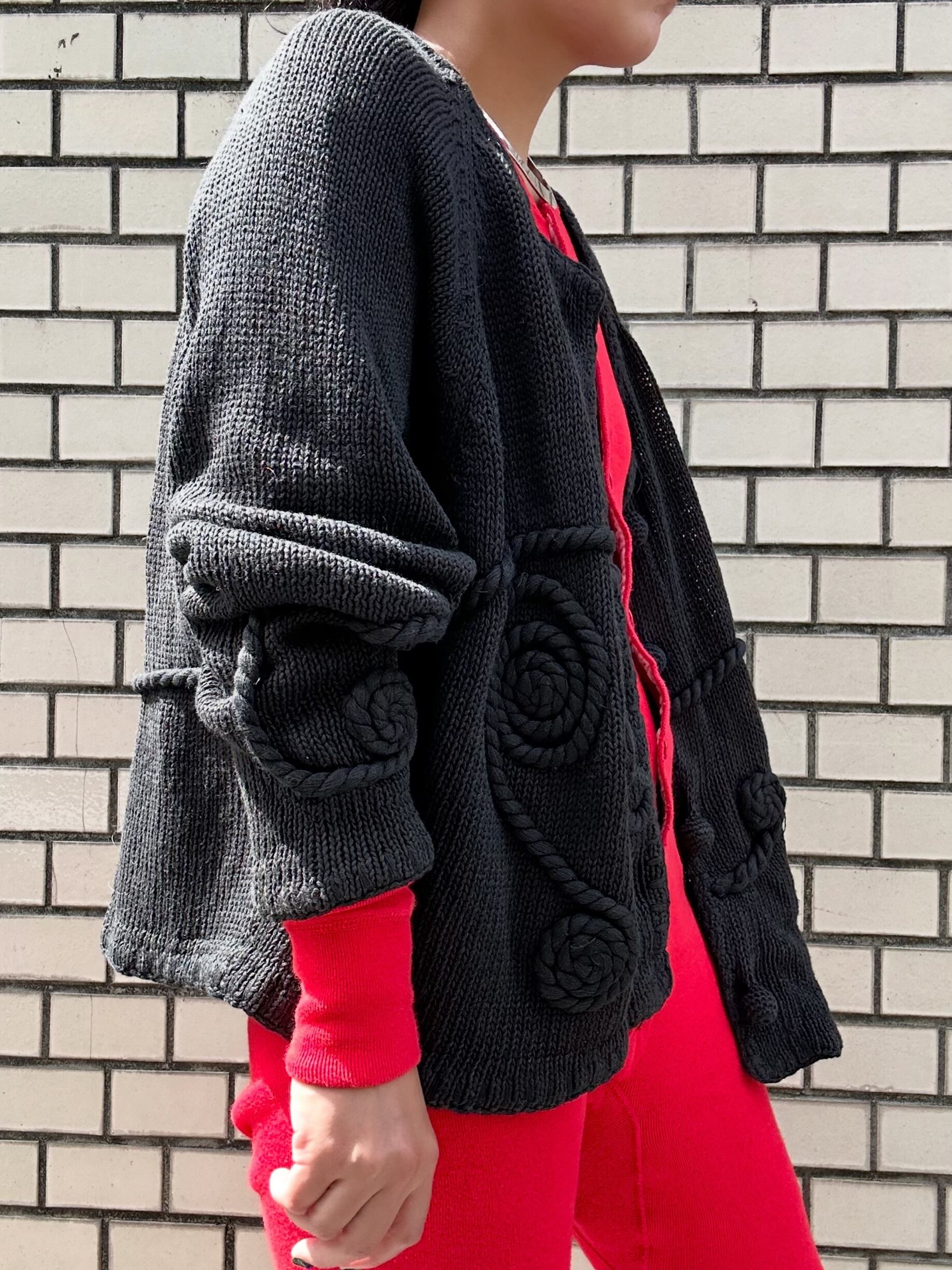 渦巻きのデザインがユニークでつい見惚れてしまいます。素材は柔らかくて肌触りの良いコットン素材のカーディガン。