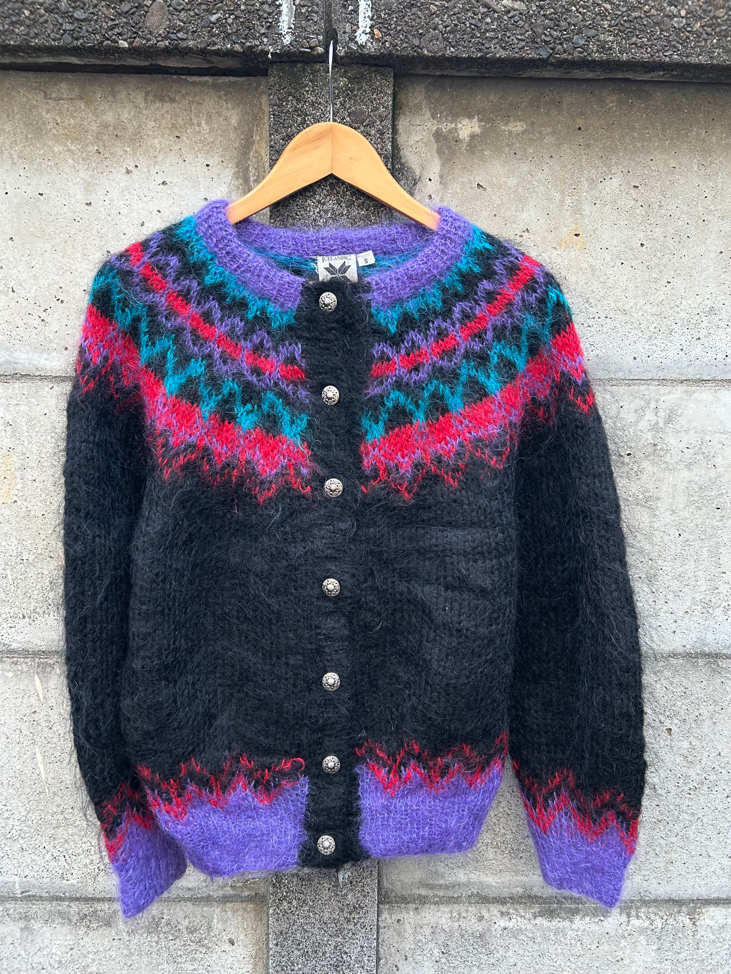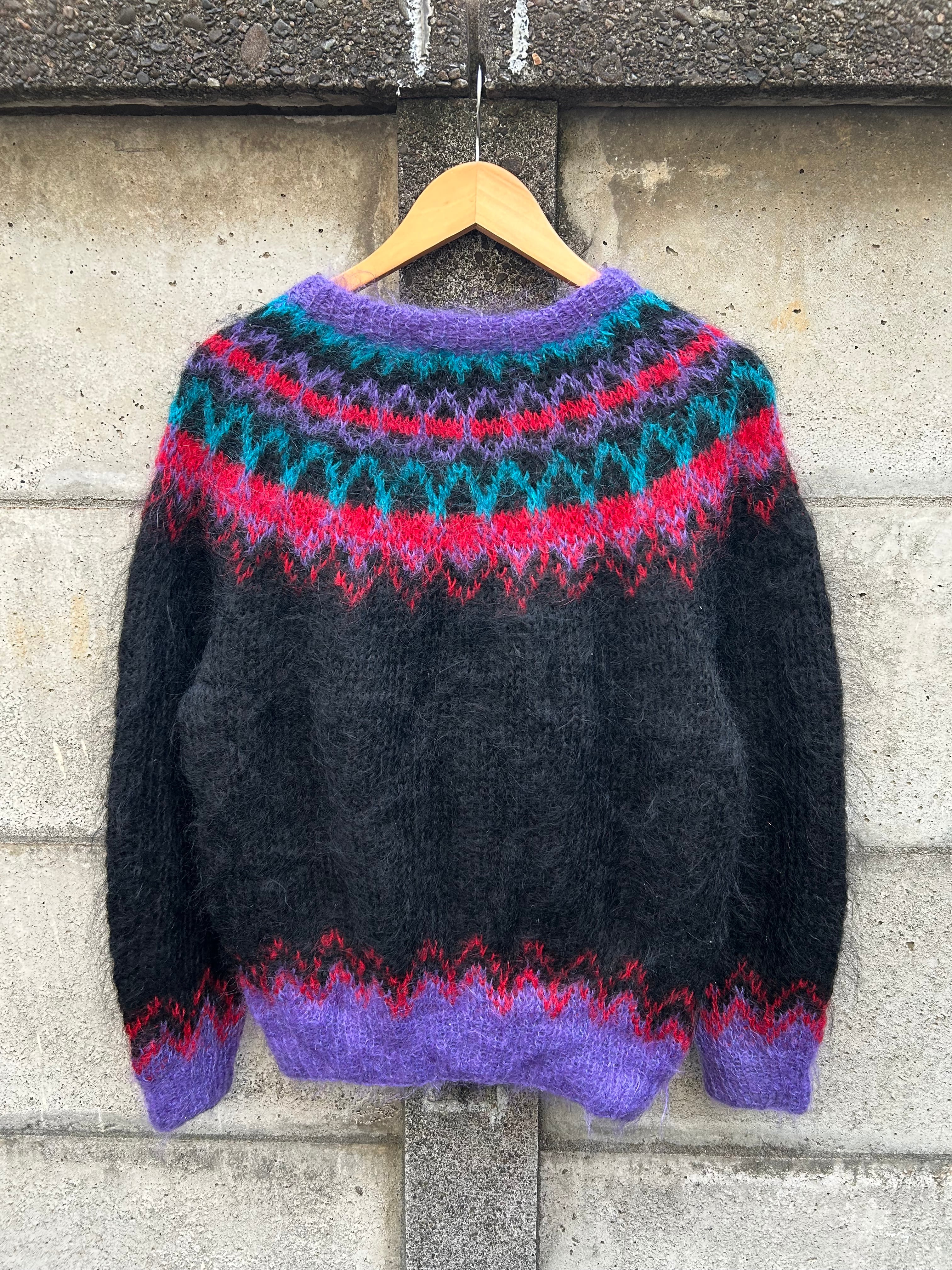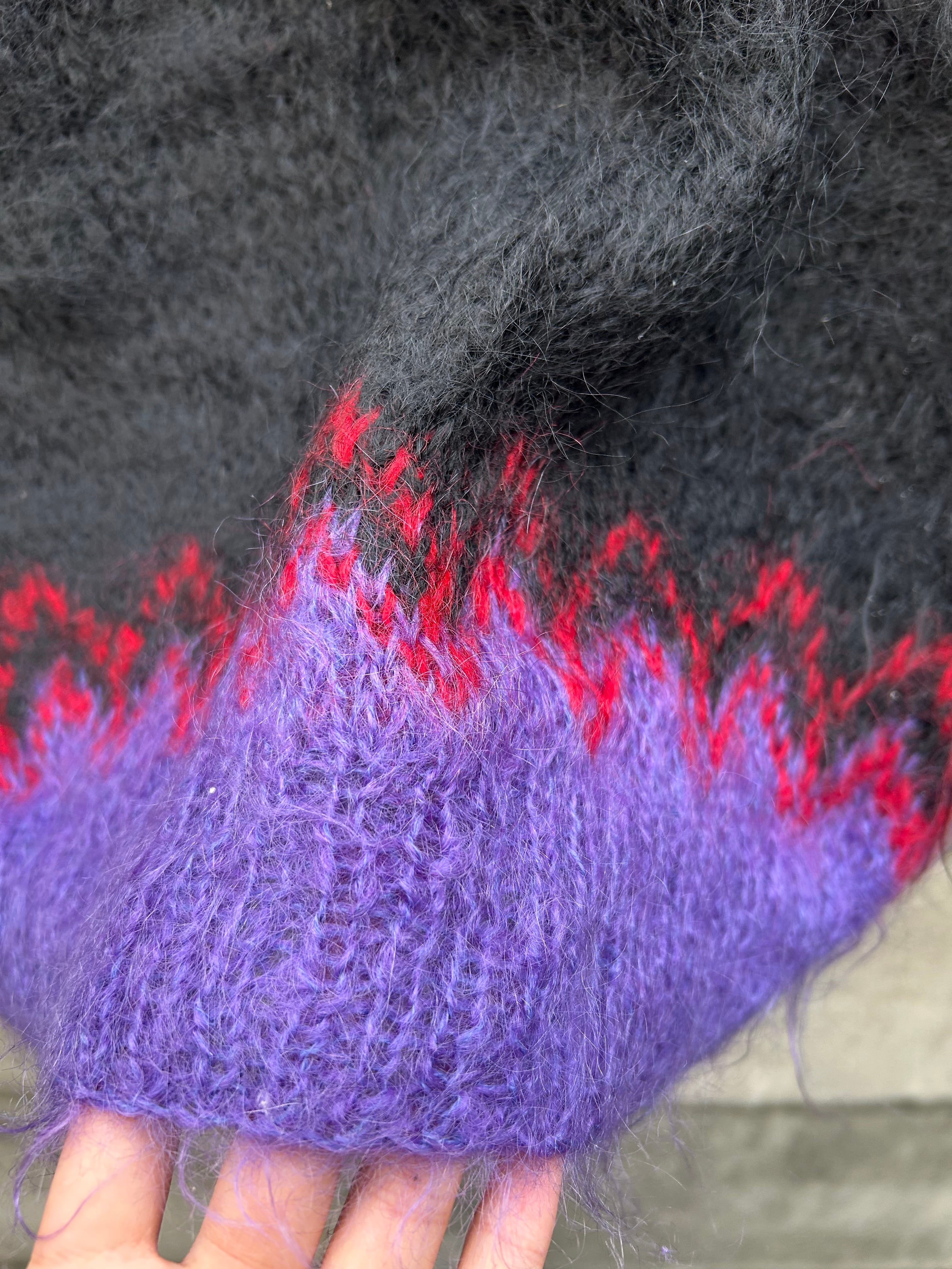 ブラックをベースに、レッド・ブルー・パープルなどのカラーをミックスしたノルディック調の編み柄が印象的。
