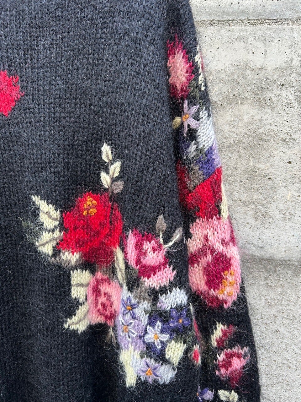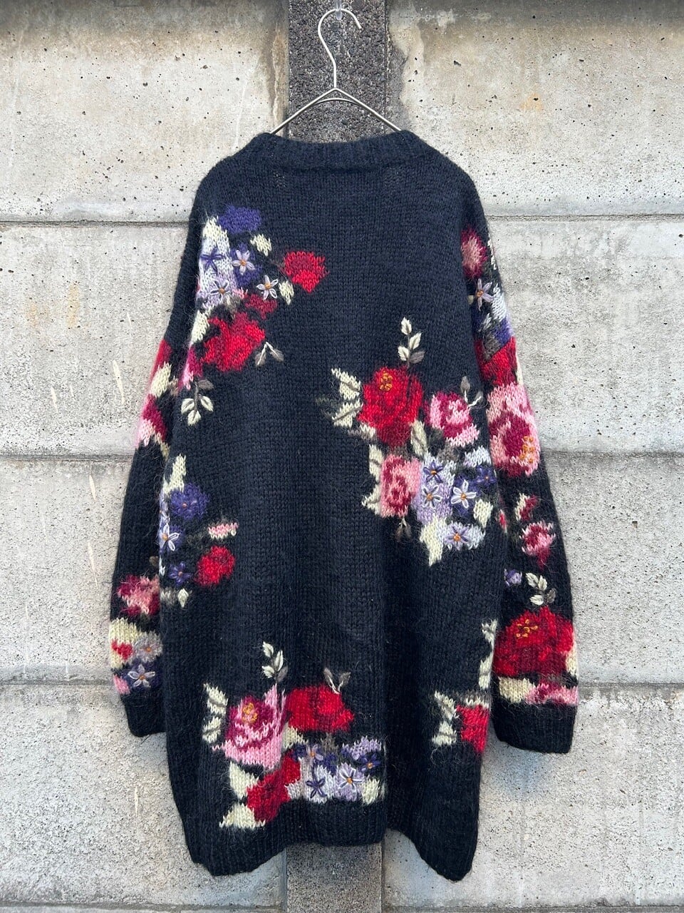 ふんわりとしたモヘア特有の柔らかな質感に、手編み風のフラワーモチーフが映えるニットカーディガン。オーバーシルエットが◎