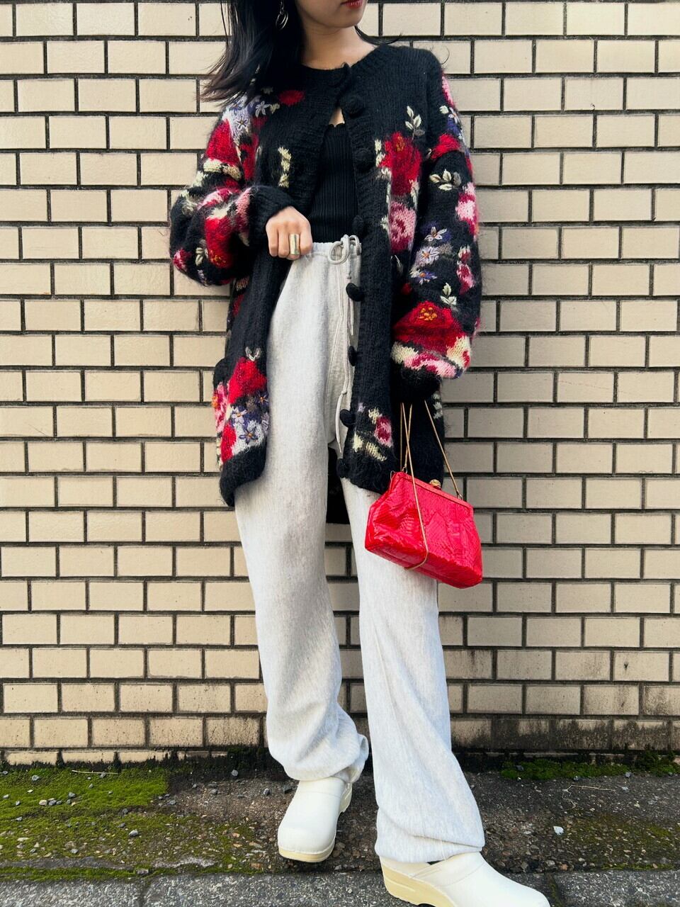 深みのあるブラックをベースに、レッド・パープル・アイボリーを中心とした花柄がアクセントになり、コーディネート全体を華やかに魅せてくれます。