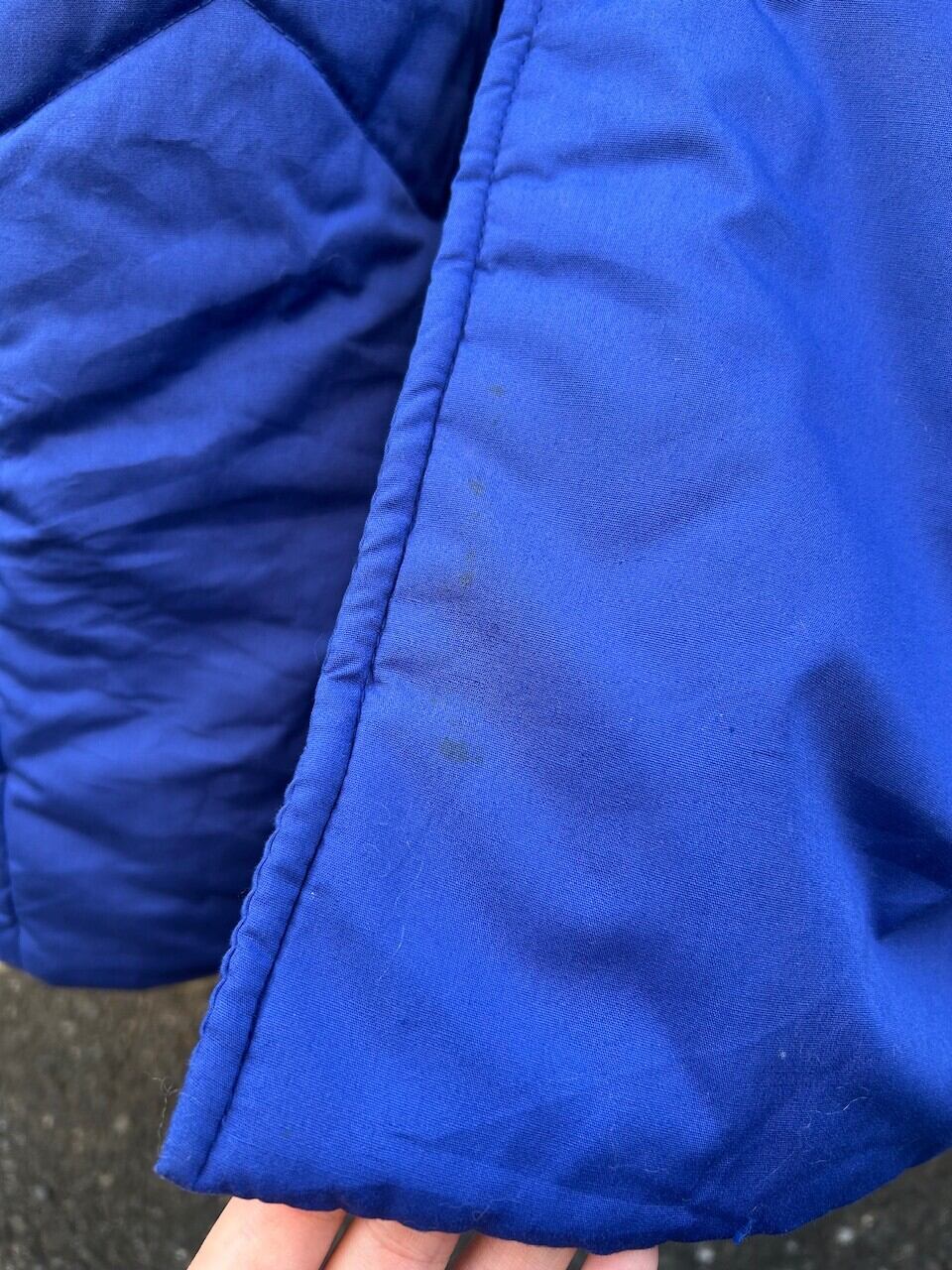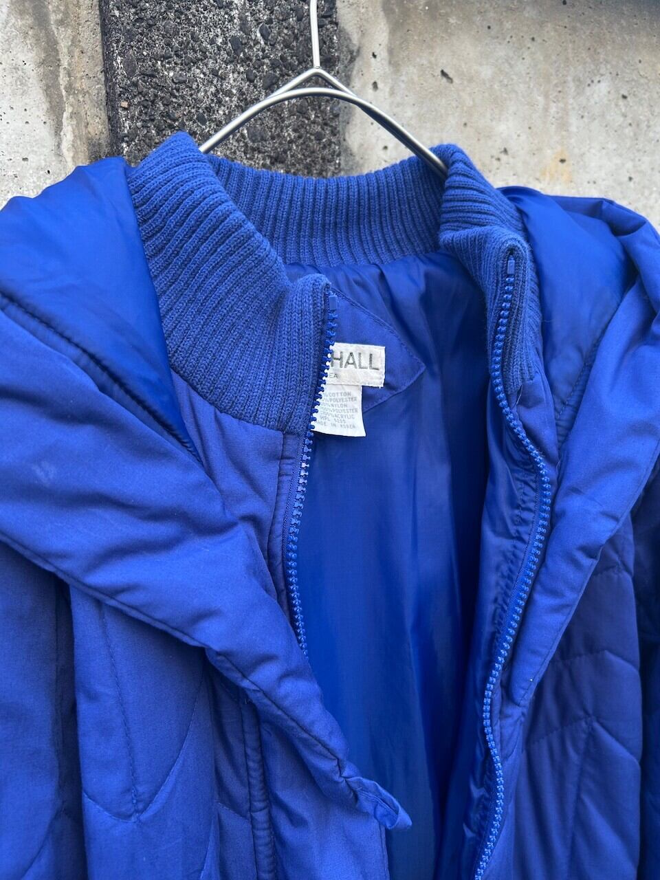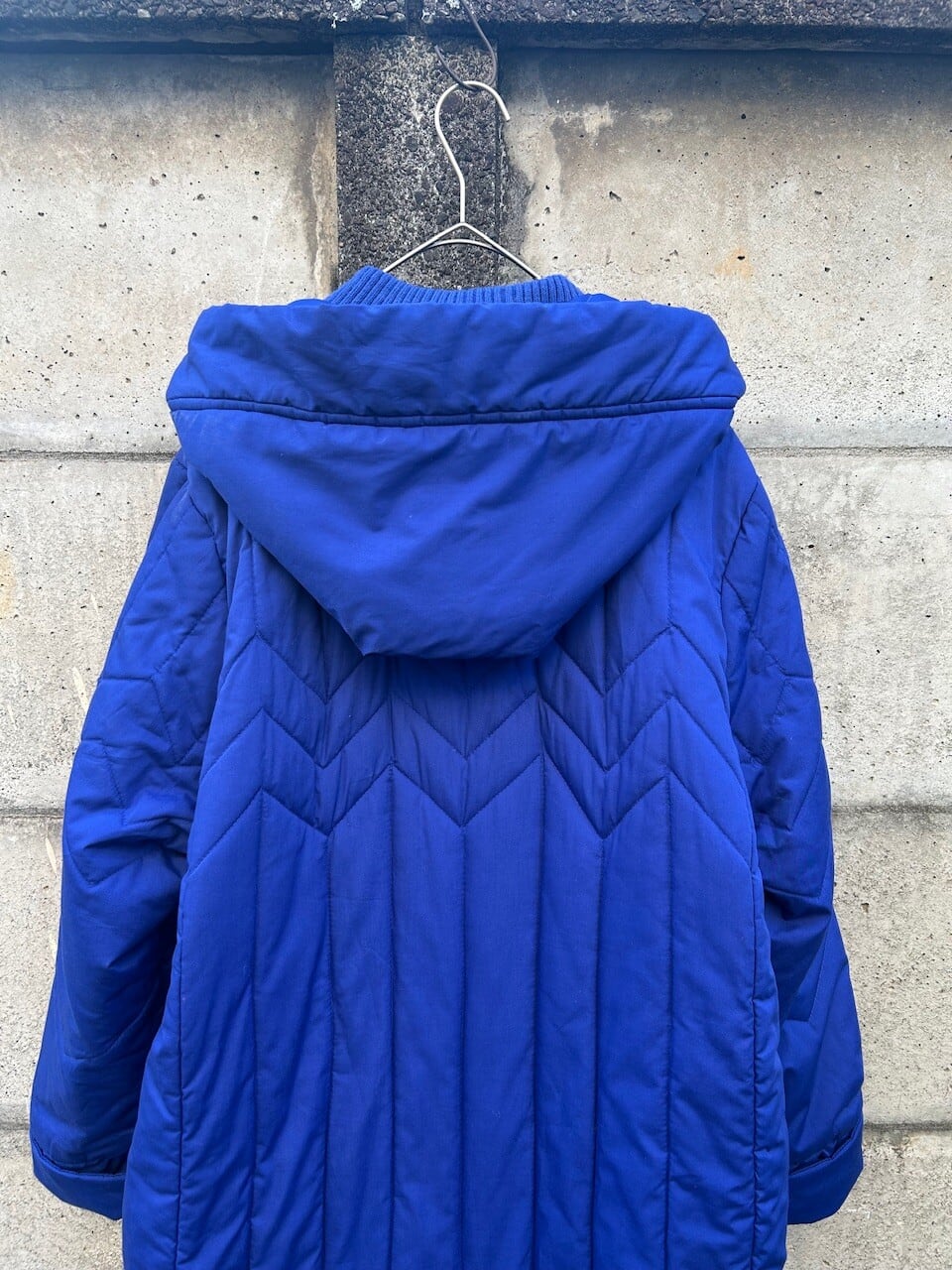 目を惹く鮮やかなブルーが印象的なロング丈のキルティングコート。