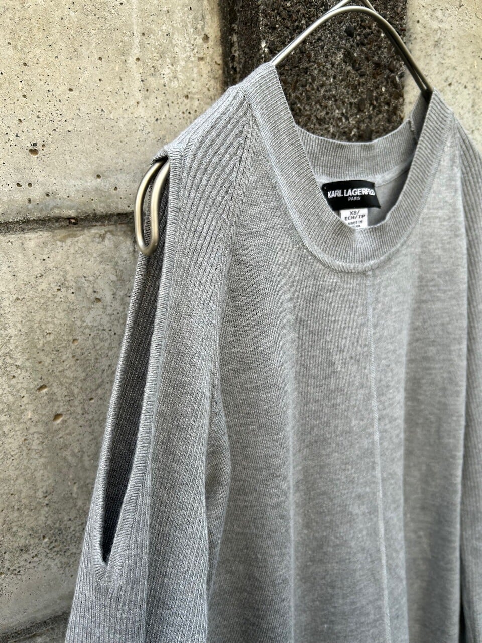 KARL LAGERFELDのオープンショルダーリブニットトップス。