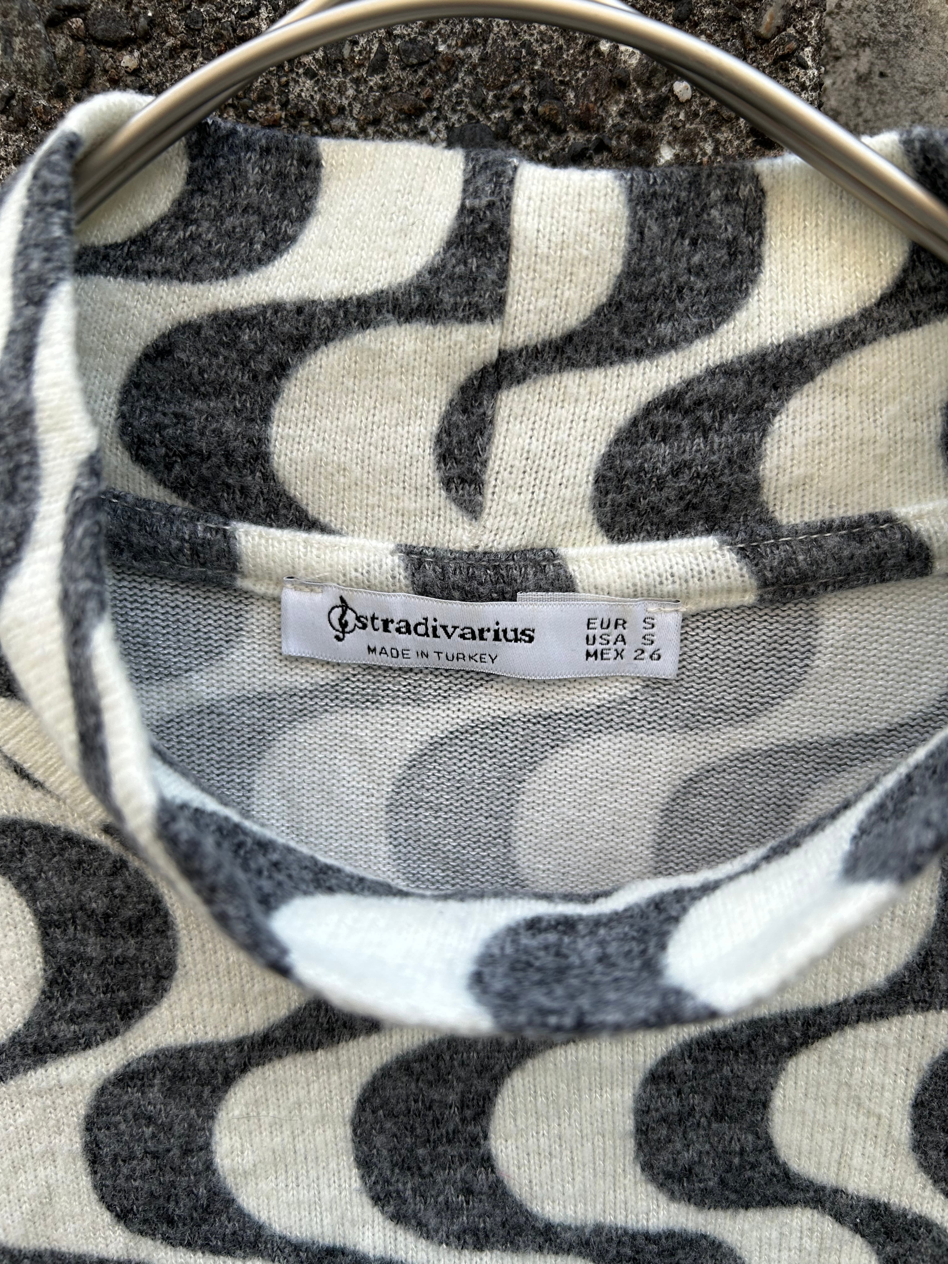 ストライプ柄のようなウェーブの波打つようなグラフィックの総柄が目を惹く、ハイネックトップス。