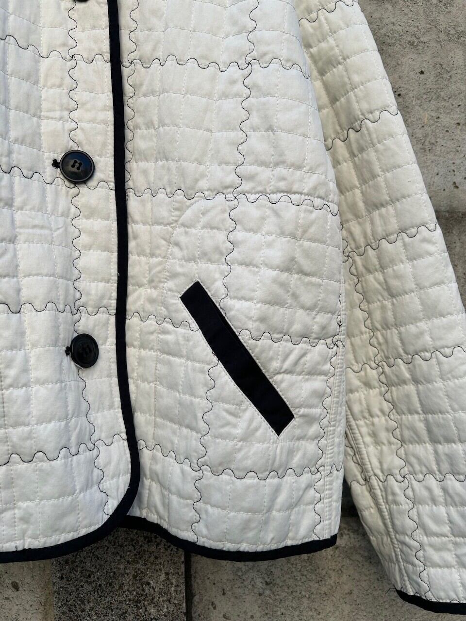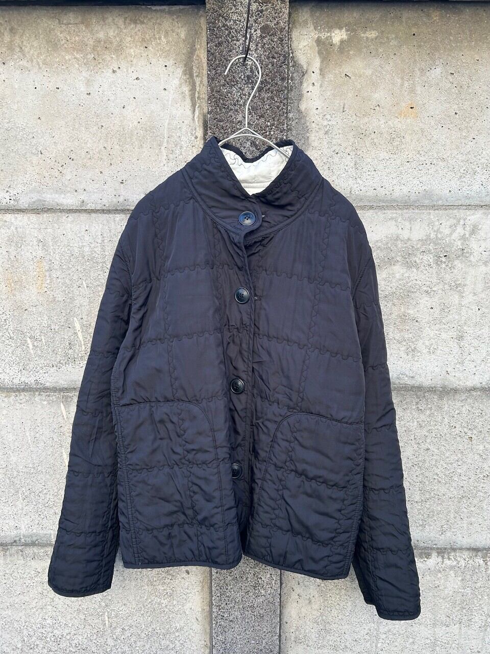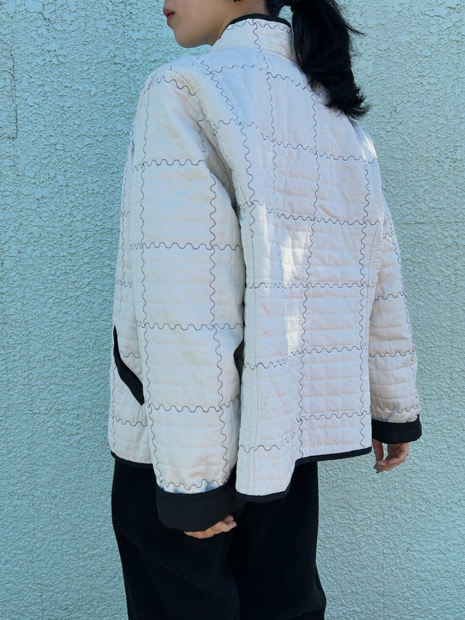 白×黒のコントラストが目を引く、リバーシブル仕様のキルティングライトジャケット。