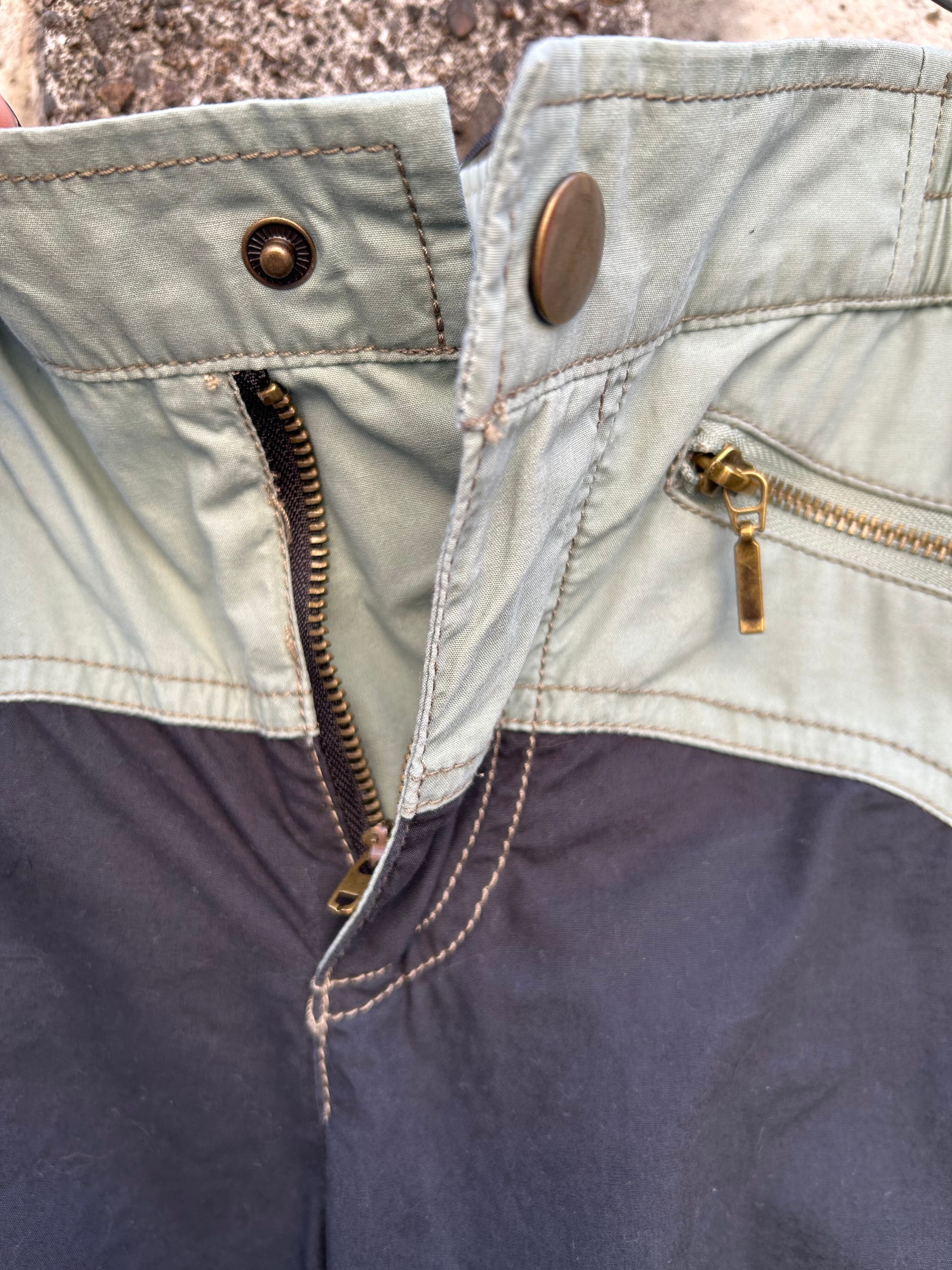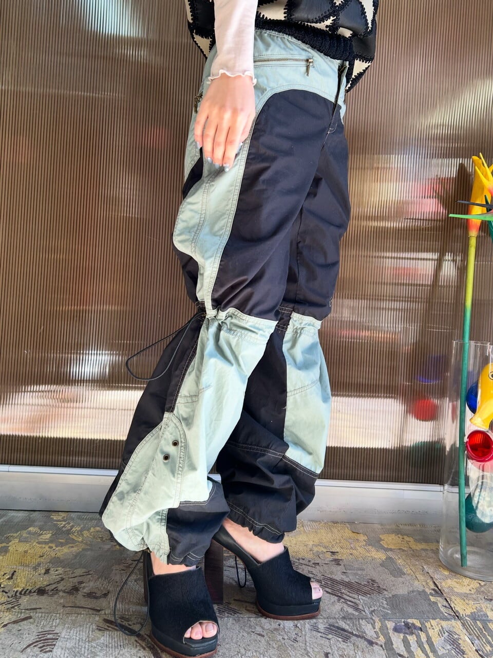 ブラック×セージグリーンの切り替えが目を引く、存在感たっぷりのデザインパンツです。
