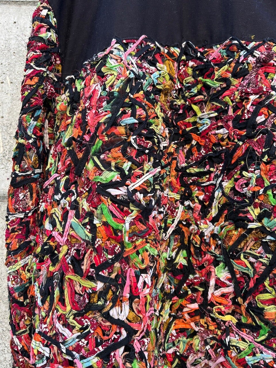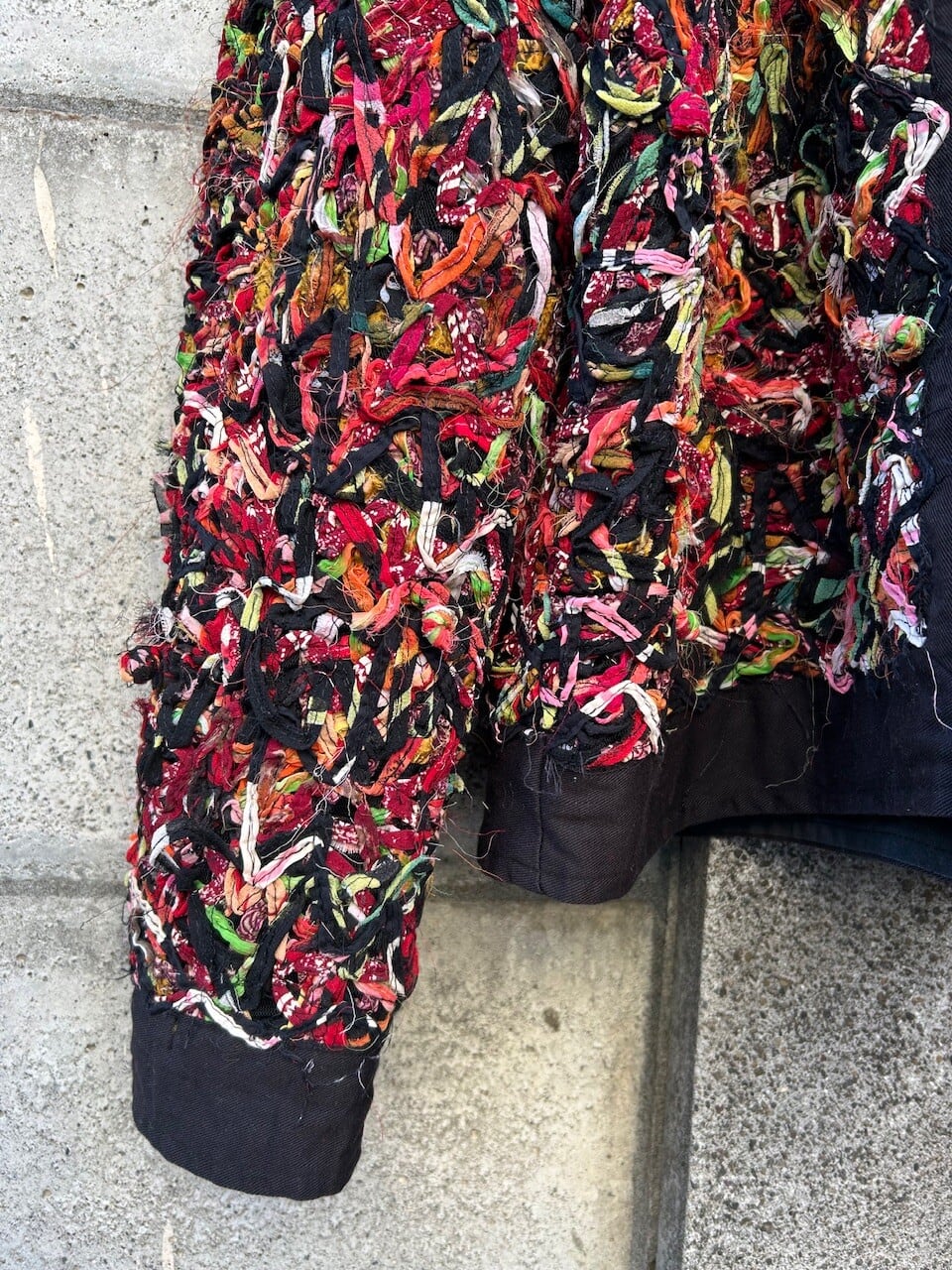 ブラックベースに、赤・ピンク・グリーン・オレンジなど様々なファブリックを大胆に縫い込んだ立体的なテキスタイル。アートピースのような奥行きと動きのある表情が魅力です♡