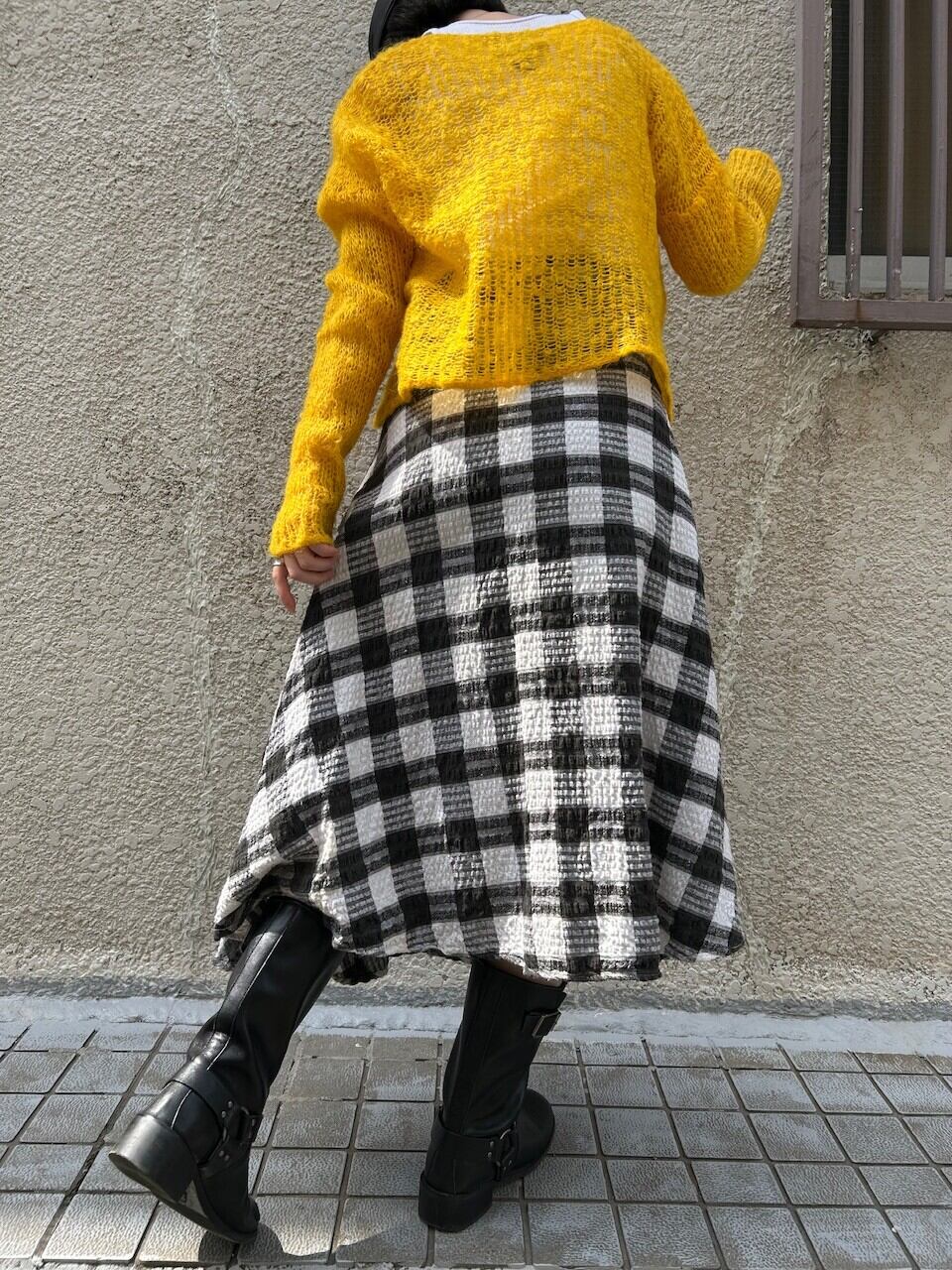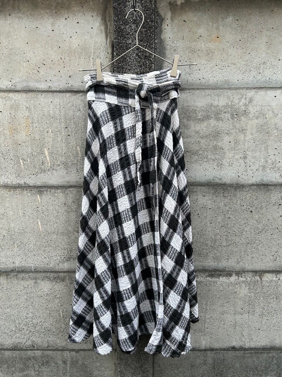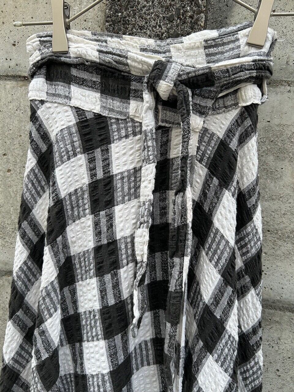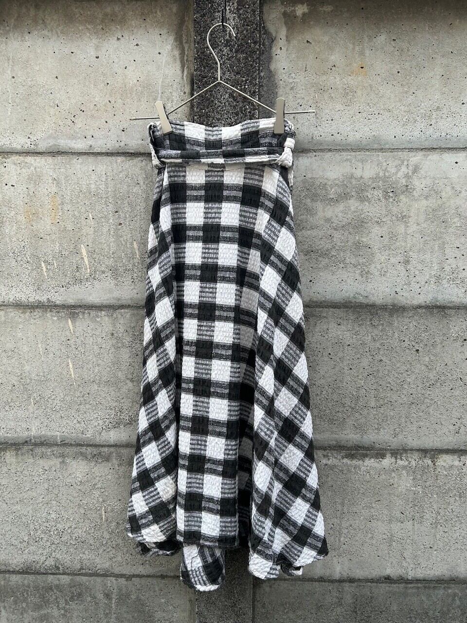 立体感のあるチェック生地を使用した巻きスカート。シンプルながら奥行きのある表情が魅力的です。凹凸のある織りが光を柔らかく拾い、モノトーンでもしっかりと存在感があります。