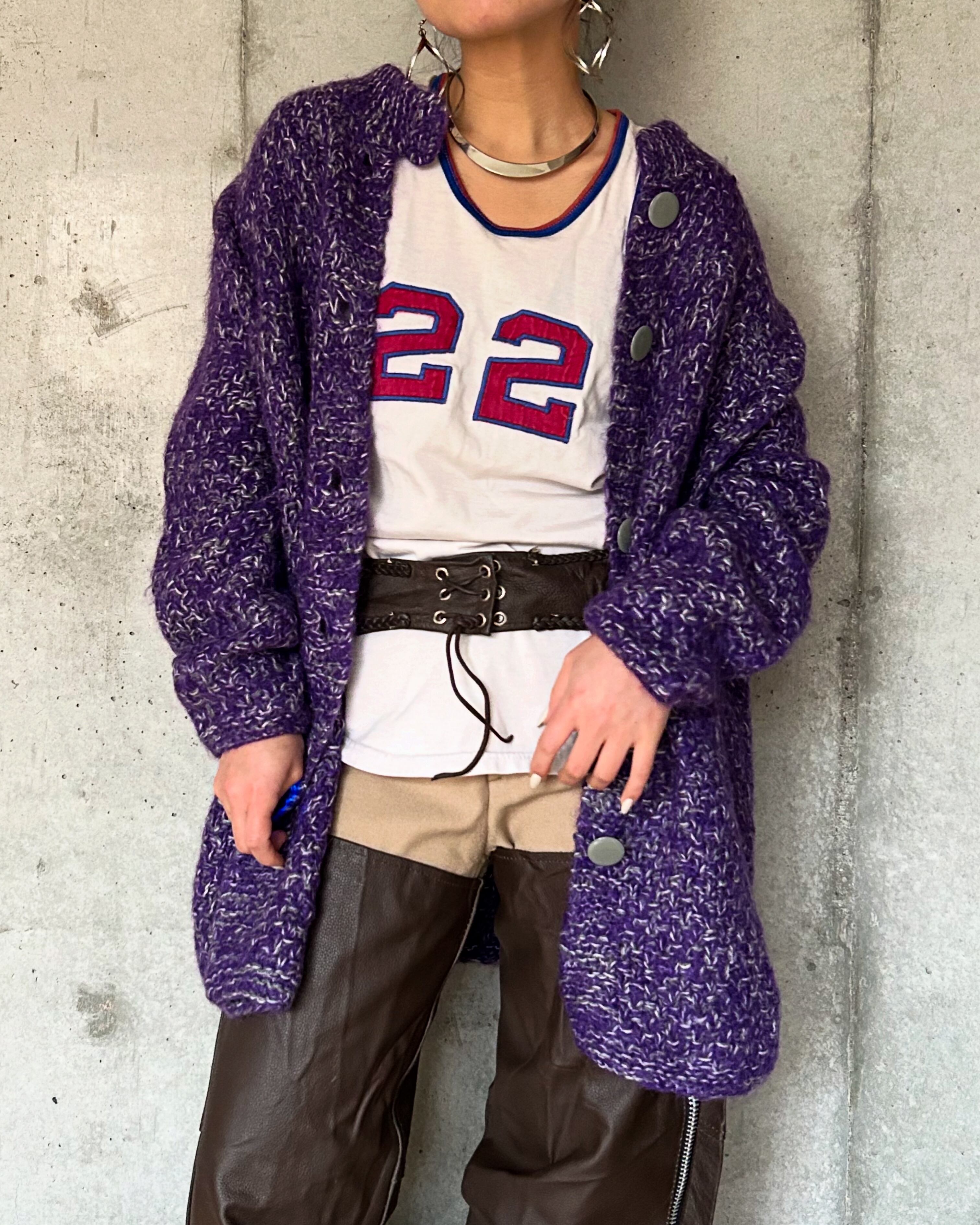 パープルとホワイトのミックスカラー。ボタンはグレーでバランスがよく大人なアクセントになっております。